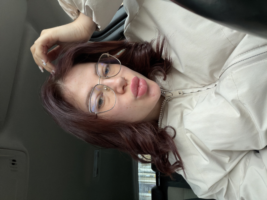 A female individual is depicted in a head-and-shoulders portrait taken from a slightly low perspective, seated within the interior of a vehicle. She has reddish-brown, wavy hair and wears thin, gold-toned, cat-eye style eyeglasses. Her lips are pursed forward, and her fair complexion is visible. She is dressed in a light beige or cream-colored puffer jacket, partially zipped, revealing a ribbed collar. Her right hand, with fingernails painted light with small red dots, is positioned near the top of her head, lightly touching her hair. The background features the dark gray headliner of the vehicle's interior at the top. Through the rear window, a blurry view of an outdoor urban or suburban setting is visible, including vague shapes of buildings and foliage. A portion of a dark steering wheel is present on the right edge of the frame. The image provides no discernible visual cues or landmarks to confirm the location as Nova Zagora, Bulgaria.