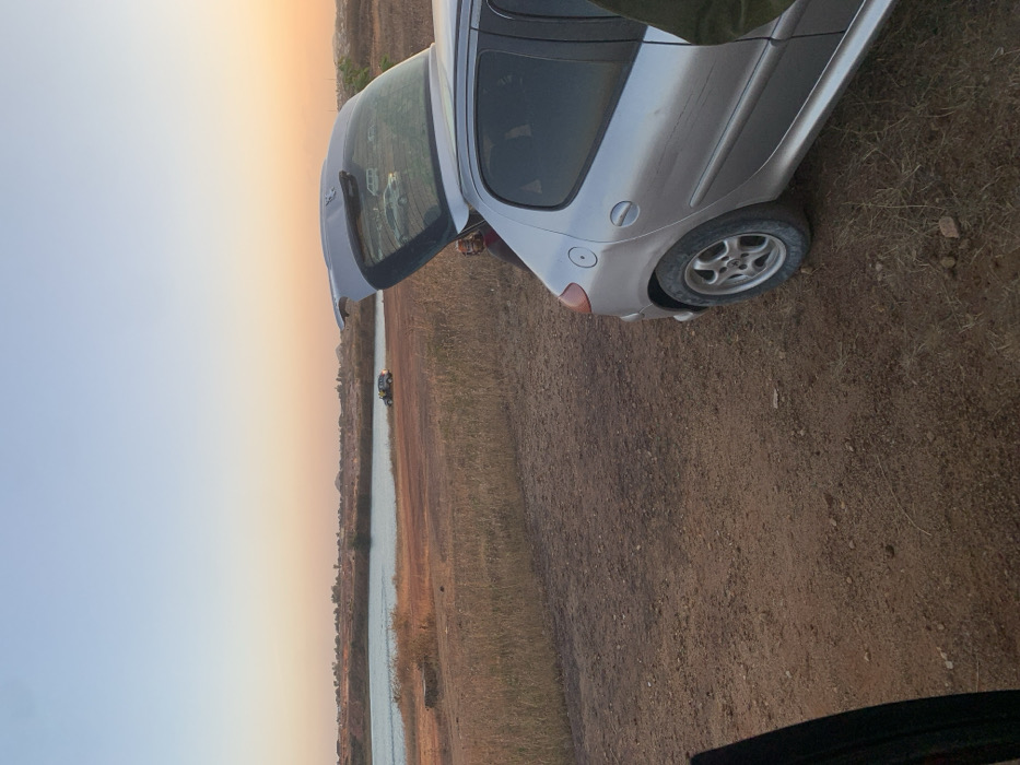 A silver hatchback car with its trunk open sits on dry, brown terrain. In the background, there is a thin body of water. The sky is a gradient of blue and orange, suggesting either sunrise or sunset. Another vehicle can be seen further down the shoreline, near the water. The car's trunk is open and a person is seemingly looking into it.