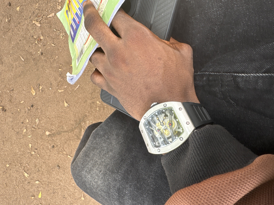 The image depicts a downward-angle view of a seated individual's lower torso and hands. The individual is wearing dark grey denim jeans. A light brown, ribbed long-sleeved garment is visible on the left forearm. A tonneau-shaped wristwatch, featuring a silver-colored case with exposed screws, a skeletonized dial revealing golden gears and internal mechanisms, and a black rubber strap, is present on the left wrist. The individual's dark-skinned right hand holds a green softcover book or notebook with multicolored graphics, which rests atop a black smartphone featuring a textured back panel. The ground in the background is reddish-brown, appearing to be sand or dirt, with scattered dry, light-colored leaves. No specific landmarks or unique features are visible to precisely identify a location within Ihiagwa, Nigeria; however, the ground type is consistent with unpaved outdoor areas in the region.