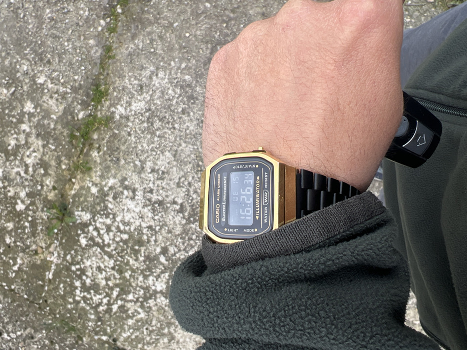 A person's left arm, clad in a dark green fleece sleeve, is depicted with a gold-toned Casio digital watch featuring a black strap on the wrist