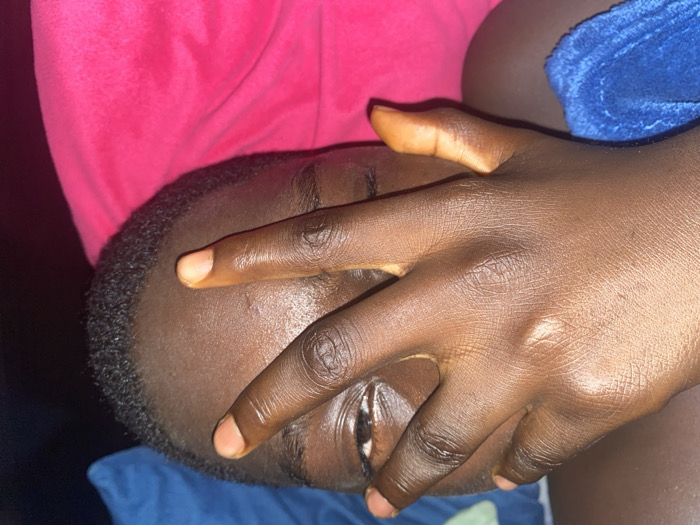 A person is seen lying down, their face partially obscured by their hand. The skin tone is dark. One eye is visible. The person is wearing a pink top and is covered with a blue blanket. The background is dark. The fingers are extended over the face.