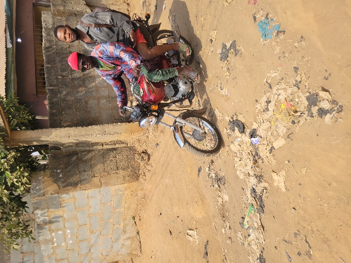 Two adult males are depicted on a red motorcycle on an unpaved dirt road in Sabojibi, Nigeria