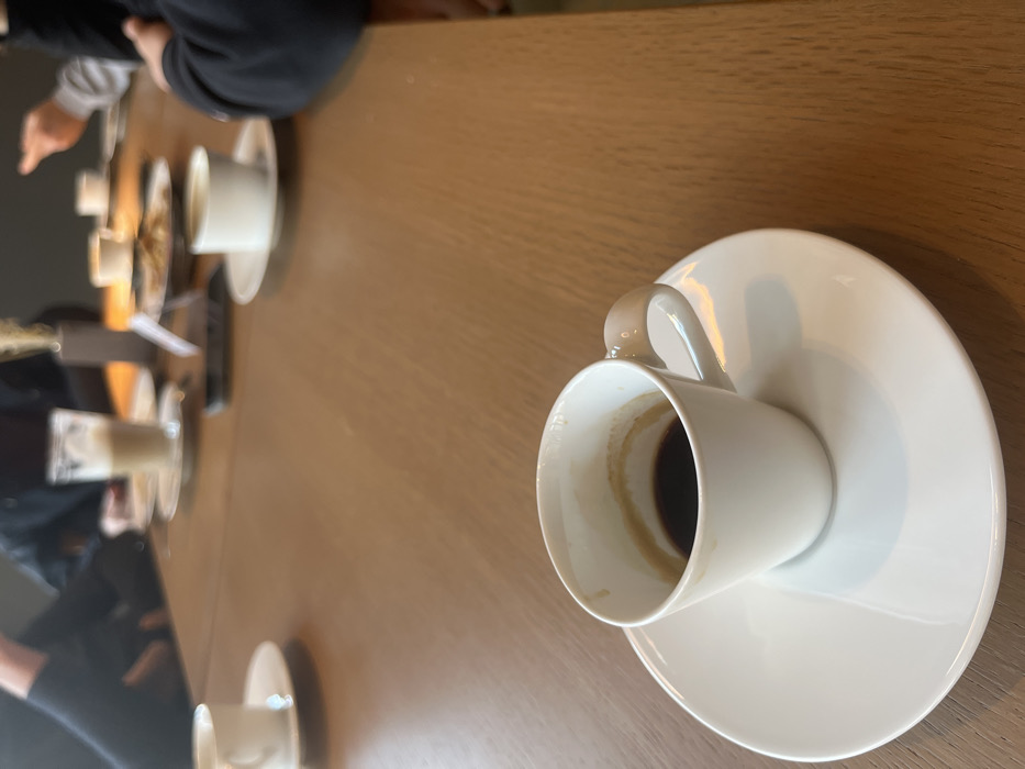 The scene is an indoor setting, likely a cafe or restaurant, located within the city of Rietheim-Weilheim, Germany. A light brown wooden table, appearing to be laminate or light wood, occupies the majority of the frame. In the immediate foreground, a white ceramic espresso cup, containing a small quantity of dark liquid with visible coffee crema residue on its interior walls, rests centered on a round white ceramic saucer. Further back on the table, blurred and out of focus, are several other items and parts of individuals. To the left, a white ceramic cup on a saucer is partially visible. Centrally, a tall glass containing a light-colored, frothy beverage, likely a latte, is present. Nearby, a dark rectangular object, consistent with a smartphone, lies on the table. A small, dark, cylindrical object with light-colored, vertical decorative elements (possibly dried grasses in a vase) stands between the glass and another white ceramic cup on a saucer to the right. A metallic dish with indeterminate contents is also visible. At least four individuals are seated around the table, though their faces are obscured or out of frame. To the far left, a person's arm, clad in dark clothing, is partially visible. Behind the tall glass, another individual's torso, also in dark attire, is discernible. To the right, an arm with an extended index finger, suggesting a gesture of pointing or emphasis, is visible, wearing a light-colored sleeve beneath a darker outer garment. Further right, another person's dark sleeve is partially seen. The overall impression is a social gathering with drinks and potential discussion.