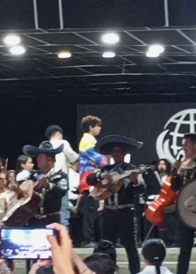 A mariachi band is performing on a stage under bright lights. The band is composed of several members dressed in traditional mariachi attire with sombreros. Some are playing guitars, while others play trumpets, and one is singing into a microphone. Behind them, a group of musicians, possibly an orchestra, are seated and playing stringed instruments. A large black screen with a white globe logo is visible in the background. The audience is partially visible in the foreground, holding up their phones to record the performance.
