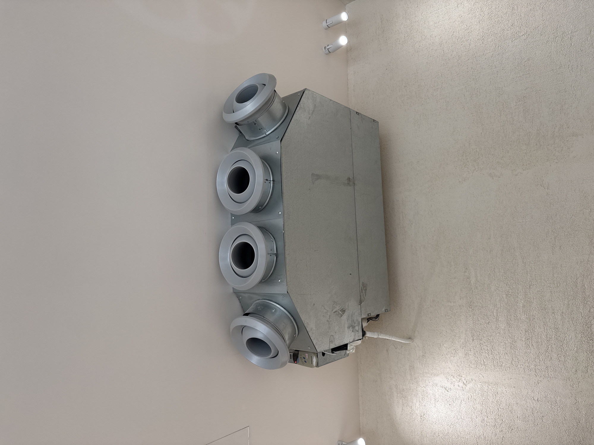 A vertically oriented, low-angle shot depicts an industrial-style ventilation unit mounted on a wall, likely indoors. The unit is constructed of a gray metal casing and has four circular vents with gray, funnel-shaped openings protruding from the front face. To the right of the unit, the wall has a textured, off-white surface. Above the unit, near the corner of the wall, are two cylindrical light fixtures. The surrounding environment appears to be a modern or recently constructed interior space. The location of this scene is in Tel-Aviv, Israel.