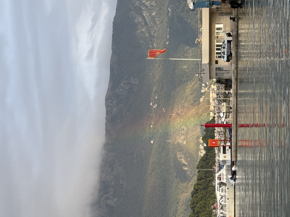 The image displays a coastal port scene in Budva, Montenegro, with a mountainous backdrop under a partly cloudy sky. The foreground is dominated by calm, reflective water, which occupies the lower third of the frame. Along a light-colored quay in the midground, multiple boats are moored, including a prominent white vessel labeled "GALEB" on its bow, with a smaller inflatable boat attached to its stern. Adjacent to the boats, a red cylindrical navigational marker stands vertically, accompanied by a rectangular yellow sign with red text. Further along the quay to the right, a single-story, light-colored building with multiple windows is visible. A white police vehicle, marked "POLICIJA" on its side, is parked in front of this building. Directly beside the building, a tall flagpole displays the red and gold flag of Montenegro, flying towards the right. A section of a blue gantry crane is partially visible on the far right edge of the frame. The background features large, verdant mountains densely covered with vegetation and dotted with scattered residential structures. The upper sections of these mountains are partially obscured by low-lying, grey clouds or mist. A distinct rainbow originates from the upper left portion of the sky, arcing downwards and terminating on the mid-slope of the mountains in the central-right area of the image. The sky above the mountains exhibits a mix of light grey and off-white clouds with patches of brighter sky. No individuals are clearly discernible within the scene, which appears static.