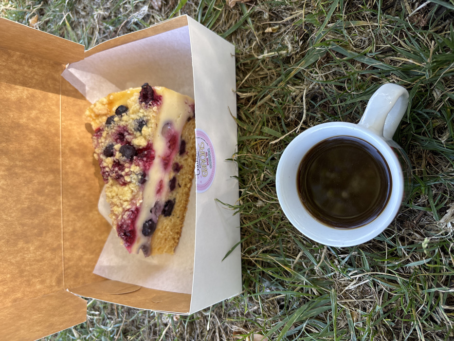 - "The image displays an outdoor scene in Tomé, Chile, featuring a single slice of berry crumble cheesecake and a cup of black coffee resting directly on green and dry grass" by FM-CB7hJ2, licensed under CC BY 4.0