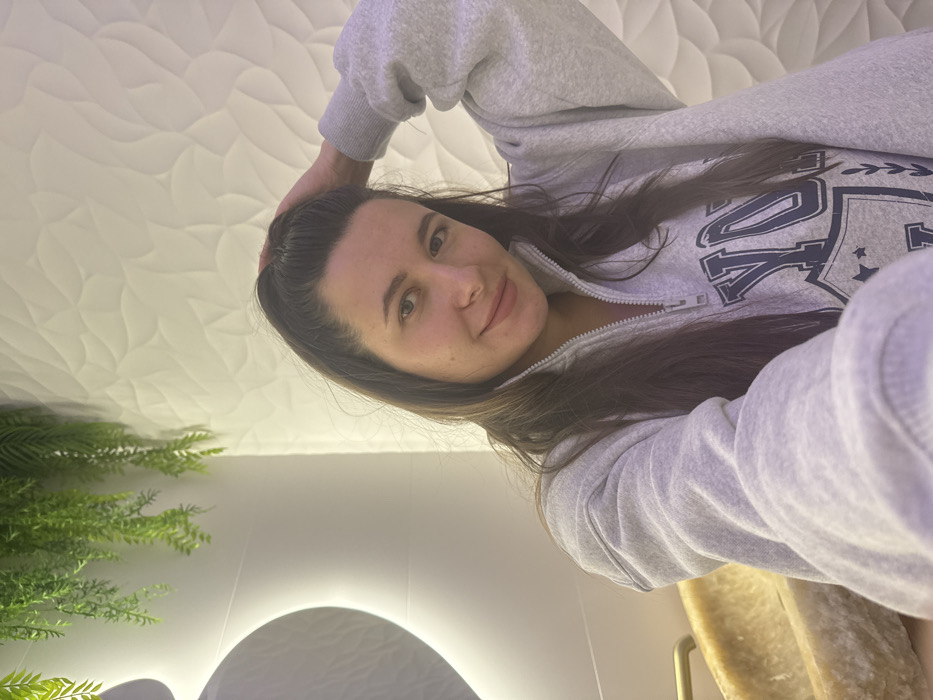 A female individual is depicted in a selfie-style portrait within an indoor environment