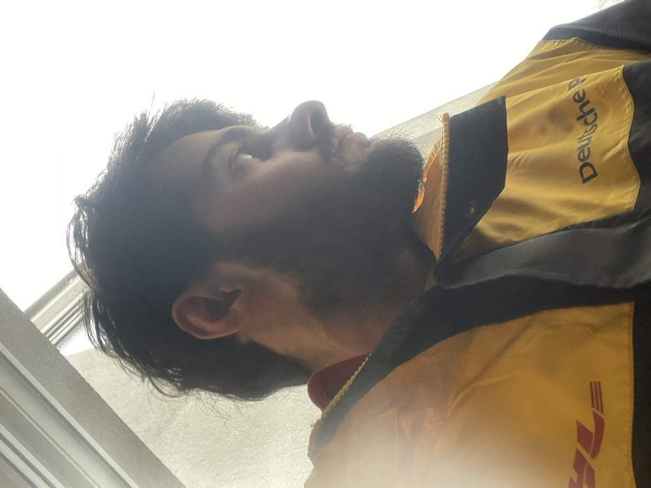 A close-up, profile portrait depicts an adult male positioned against an overexposed, bright white background, indicative of a strong light source or window. The subject faces towards the right side of the frame, looking slightly upwards. He has dark hair, a beard, and a mustache. He is wearing a yellow and black jacket featuring the red "DHL" logo on the left chest area and "Deutsche Post" text on the right chest area. A red garment is visible beneath the jacket's collar. A blurred grey structure, possibly a window frame, is present in the upper left portion of the image. The lighting creates a partial silhouette effect on the subject and a lens flare in the lower left. The individual is a delivery worker or employee of Deutsche Post DHL Group, and the scene is located in Nuremberg, Germany.