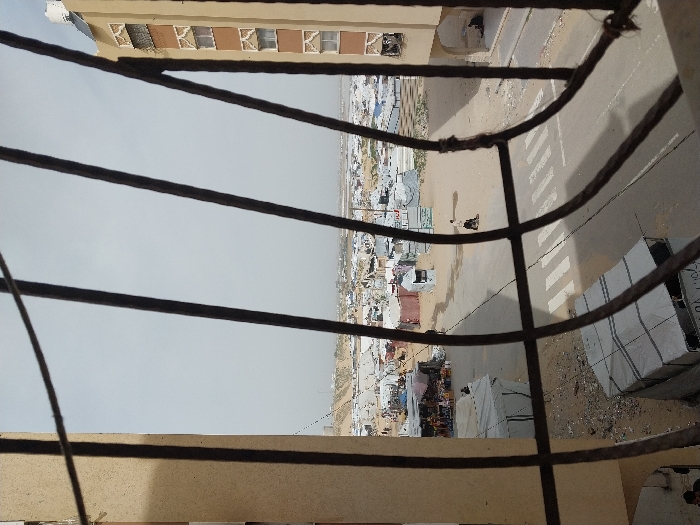 The image captures an elevated, outdoor perspective of a scene in the city of Khan Yunis, Palestinian Territory, viewed through five dark, vertical metal bars and one horizontal bar