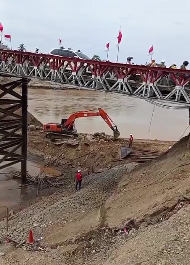 The scene is dominated by an orange excavator operating on a sandy bank next to a muddy river. The excavator is actively digging and moving material. Two individuals in red shirts and hard hats are visible near the excavator, potentially directing or observing the operation. Above them, a steel truss bridge, painted with alternating red and white sections, spans the river. Several vehicles, including a white SUV, are crossing the bridge, and people can be seen standing on it. Red flags are mounted along the length of the bridge. The sky is overcast, and the overall environment suggests an active construction or maintenance project occurring near the river. A brown, dirt hillside is in the foreground, adding to the industrial feel of the scene.
