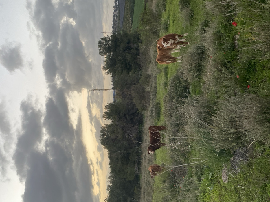 A landscape scene unfolds under a cloudy sky. A row of trees bisects the image, with a faint transmission tower visible behind. Grass and bushes fill the lower portion of the frame, interspersed with scattered red poppies. Brown and white cows graze amidst the greenery, their bodies angled slightly away from the viewer. The overall composition presents a rural setting.
