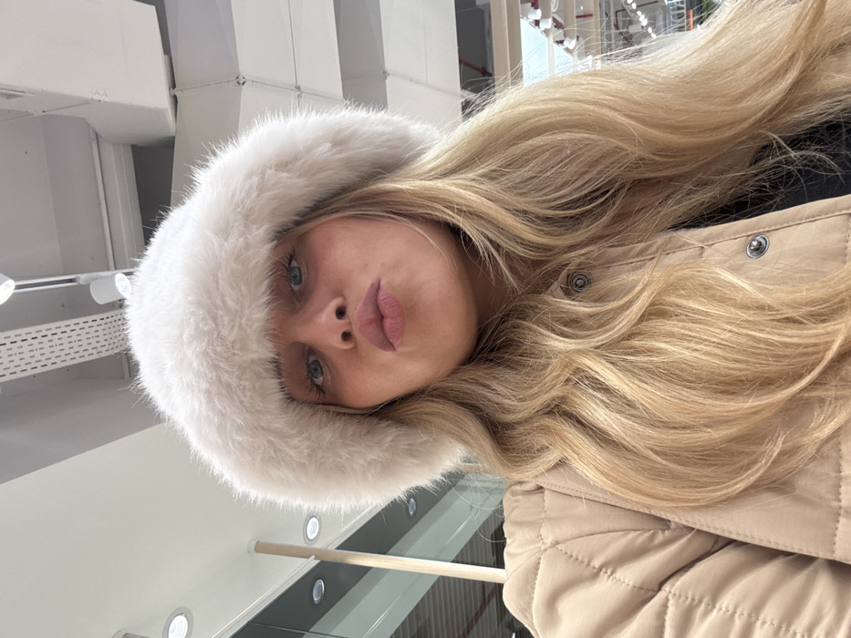 A blonde woman with fair skin is positioned in the center, wearing a white fur-trimmed hood and a tan quilted jacket. She is looking directly at the camera with blue eyes and slightly pursed lips. Her long blonde hair cascades around her face and over her shoulder. The background includes parts of a building with visible lights and structures. The image is rotated slightly.