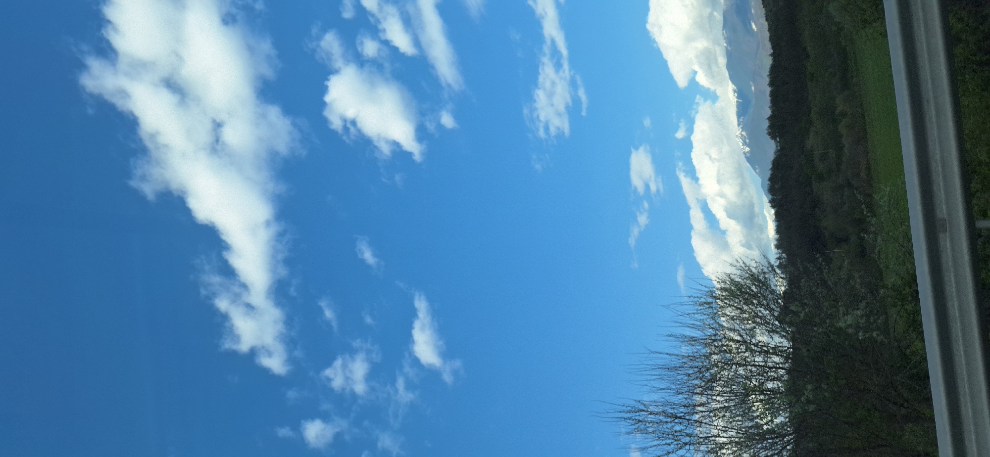 The image depicts a bright blue sky with scattered white clouds. In the periphery, there is a glimpse of mountains with snow. In the lower right of the image, one can see tree branches, green vegetation, and part of what seems to be a metal guardrail. The image provides no information suggesting it was taken in the city of Strumyani, Bulgaria. The picture appears to be taken from a moving vehicle.