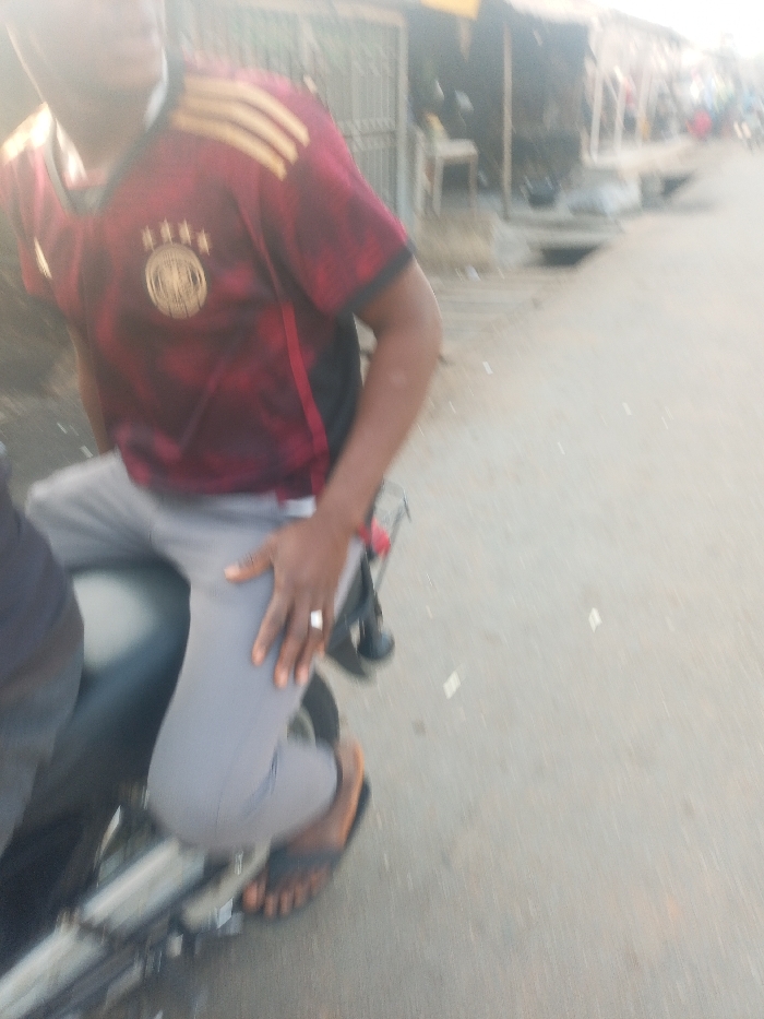 A person wearing a Germany soccer jersey and grey pants sits on a motorcycle. The person is wearing flip-flops. The background includes blurred structures resembling shops or houses, indicating a street setting. The road surface is visible. The person wears a ring on their left hand. The image is somewhat blurred, suggesting motion.