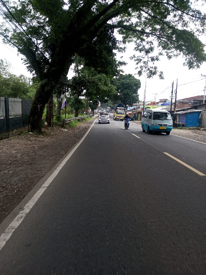 The image displays a two-lane asphalt road in Khajuripada, India, under an overcast sky, viewed from a low perspective looking down the road. On the left, an unpaved shoulder with dark earth and scattered debris runs alongside a solid white road line. A large tree with a dark, moss-covered trunk and dense green foliage dominates the left foreground, its branches extending over the roadway. Behind this tree, a dark fence with white vertical slats is visible, followed by more trees and dense vegetation. Traffic is present on the road. In the right lane, a light blue and white passenger van, possibly a Mitsubishi L300 model, is traveling towards the viewer. Behind the van, a motorcyclist wearing a dark helmet and clothing is riding a dark motorcycle, moving away from the viewer. Further ahead in the left lane, a yellow flatbed truck with a dark, covered load is followed by a silver hatchback car, both also moving away from the viewer. Additional vehicles are visible in the distant background. On the right side of the road, beyond a dashed yellow centerline segment, a series of low-rise buildings with varied roofs, including red tiles and a prominent blue tarp covering a section, line the street. Utility poles with multiple overhead wires stand against the light grey sky. No pedestrians are distinctly visible.