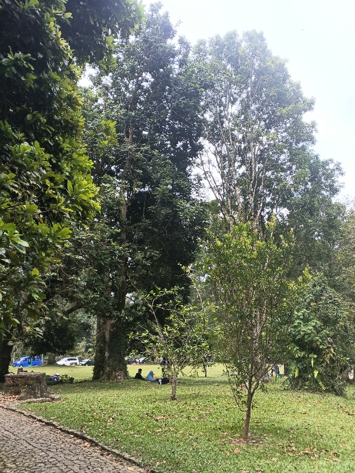 This image depicts a park or green space located in Kwekwe, Zimbabwe, under a bright, overcast sky. In the foreground, a light-colored, patterned paved path, possibly cobblestone, curves from the lower-left corner towards the center. To the right of the path, a low, square, weathered stone structure with a flat top is visible. The midground consists of a large expanse of green grass with scattered brown leaf litter. Several mature trees with dense green canopies, varying in height and foliage density, dominate the background and midground. Closer to the foreground, a few smaller trees and shrubs with lighter green leaves are present. Human activity is observed in the midground: under the shade of a large tree on the left, at least two individuals are seated or reclining on the grass; one is distinctively wearing a light blue head covering or garment. Their positions suggest passive relaxation or social engagement. Further to the right and deeper into the scene, additional indistinct figures are scattered across the grassy area. Vehicles are parked in the background on the left side of the scene. A blue van or bus is parked behind a large tree, and to its right, several white or light-colored cars are lined up on what appears to be an unpaved surface beyond the main grassy area. The overall environment is lush and verdant, indicative of an outdoor recreational setting during daylight hours.