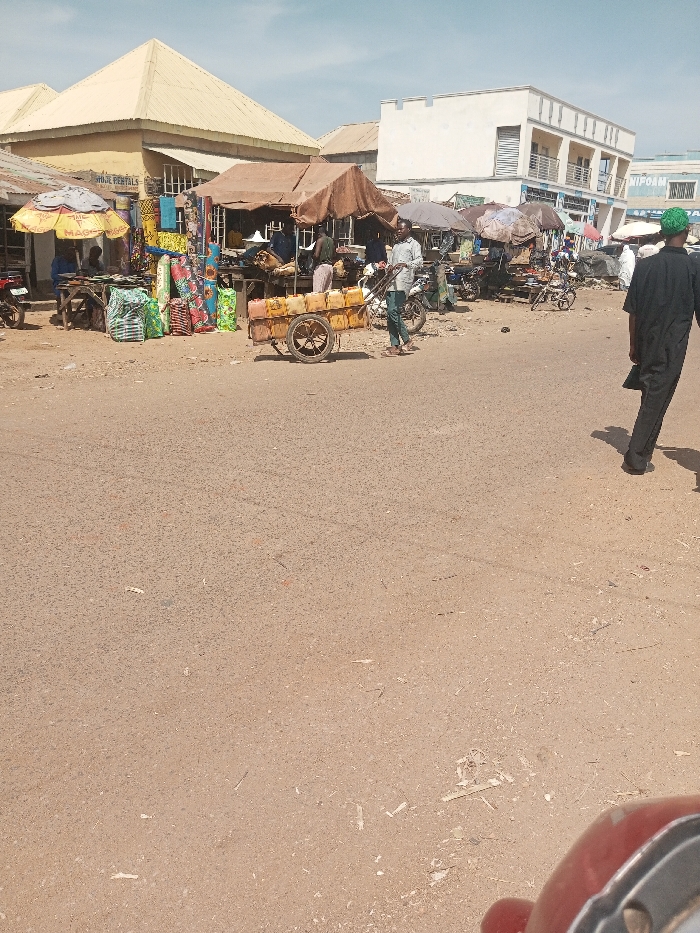 The image captures an active street scene in Kawo, Nigeria, under daylight with a clear sky