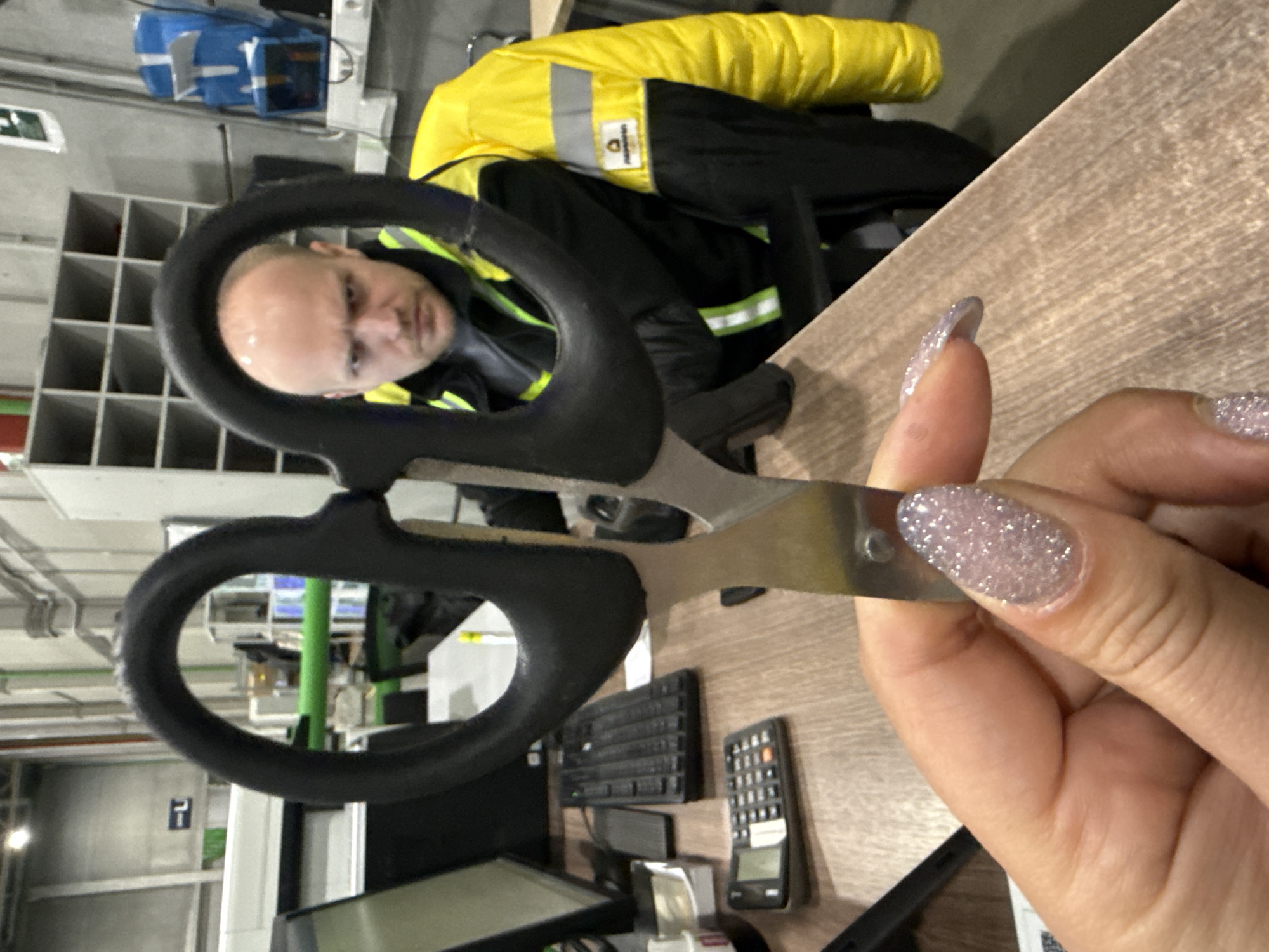 A person is holding a pair of black-handled scissors in the foreground, with a man wearing a yellow and black jacket looking through the handle's opening