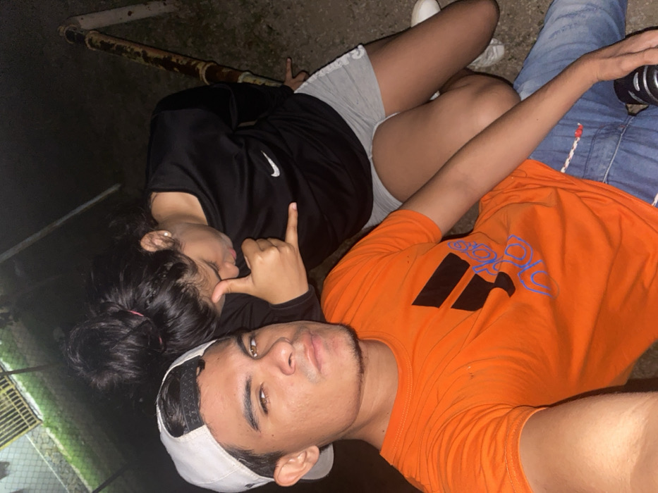 A selfie of a young man and woman in low lighting. The man wears an orange t-shirt with a large Adidas logo and a white baseball cap. The woman is behind him, wearing a black Nike shirt and gray shorts. She is making a hand gesture. A rusty metal bar is above them. A chain link fence is visible in the background.