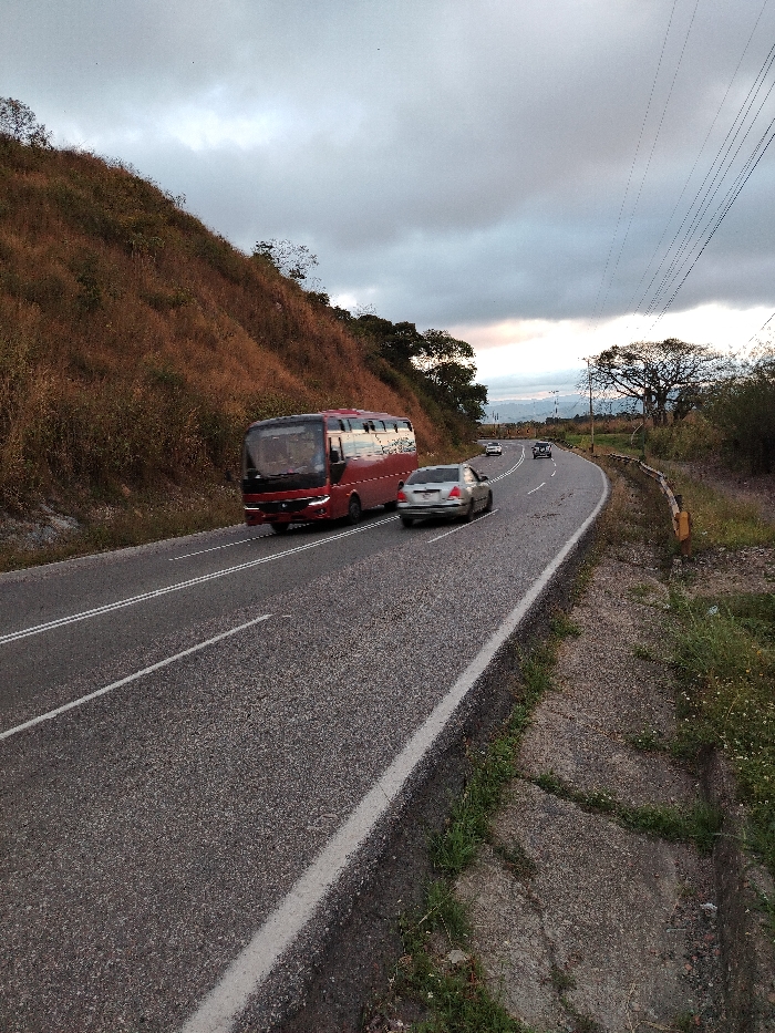 A rural highway winds between a grassy hillside and a tree-lined edge. A red passenger bus and a silver sedan travel along the road. Two vehicles are visible in the distance. Overhead power lines crisscross the sky beneath a cloudy sky. Concrete drainage ditches line the road's edge. The hillside appears dry, with brown vegetation.