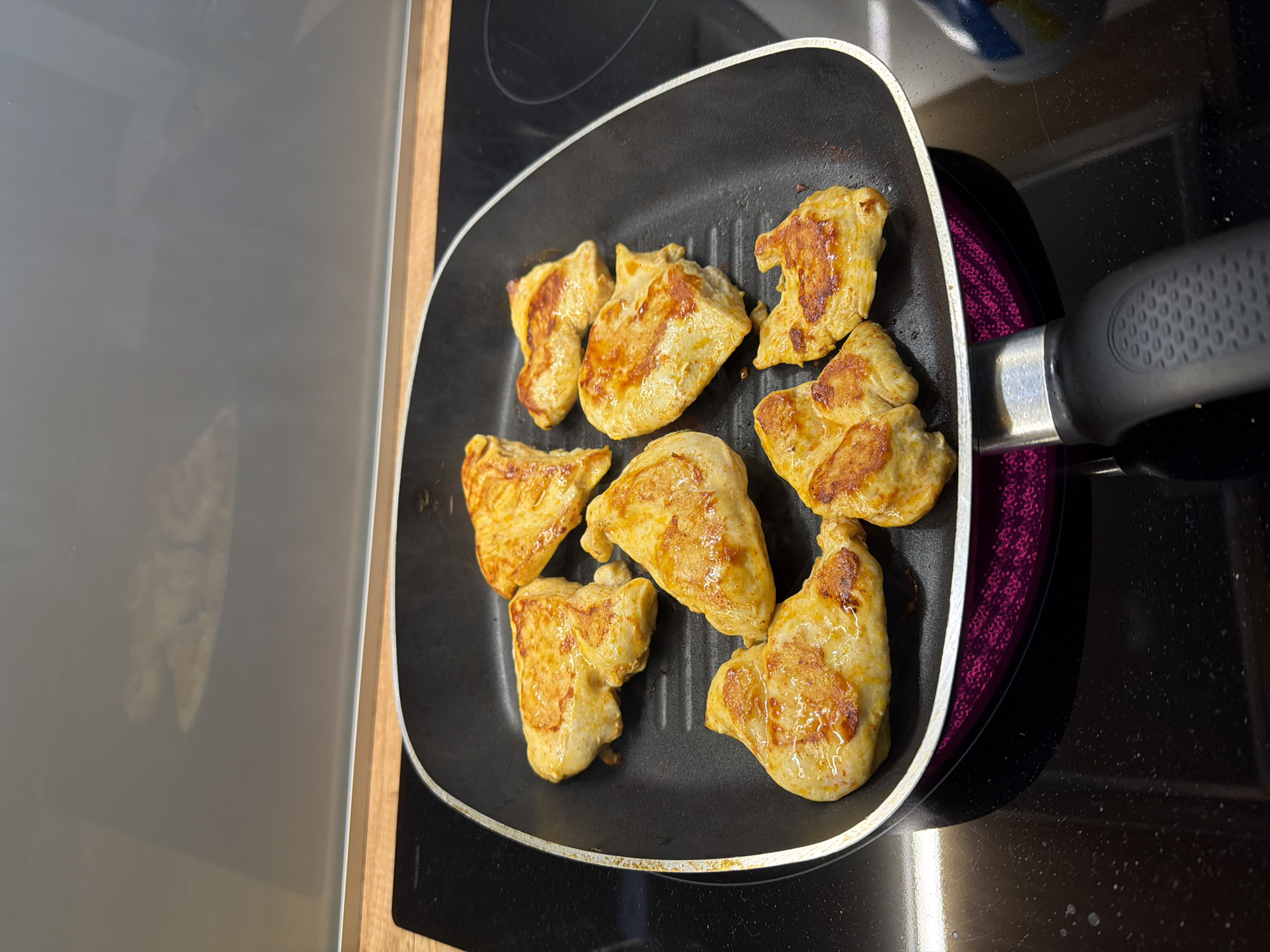 A black grill pan containing cooked chicken pieces sits on a modern electric stovetop