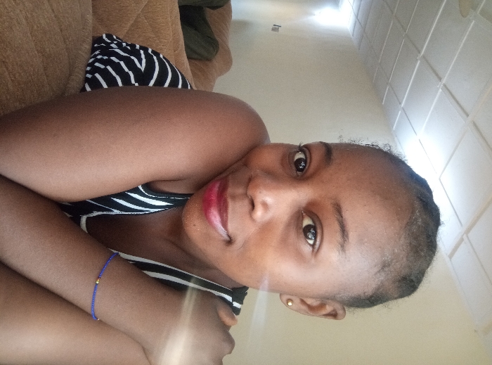 The scene depicts a young adult female, of dark complexion with dark hair pulled back, sitting indoors in Keffi, Nigeria