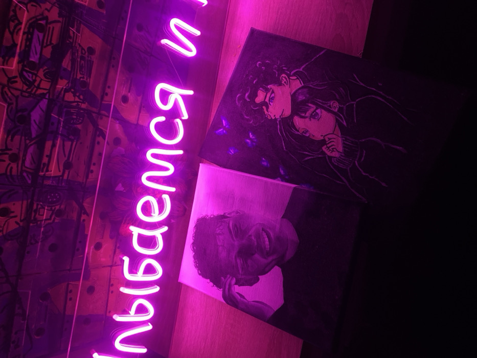 Two artworks are positioned atop a wooden surface, illuminated by a neon pink light. One canvas features an anime-style depiction of two figures and several butterflies, rendered in dark colors with light outlines. The other canvas showcases a portrait of a smiling person, also in a predominantly dark palette. The pink neon light spells out Russian words. A blurred graphic panel hangs on the background.