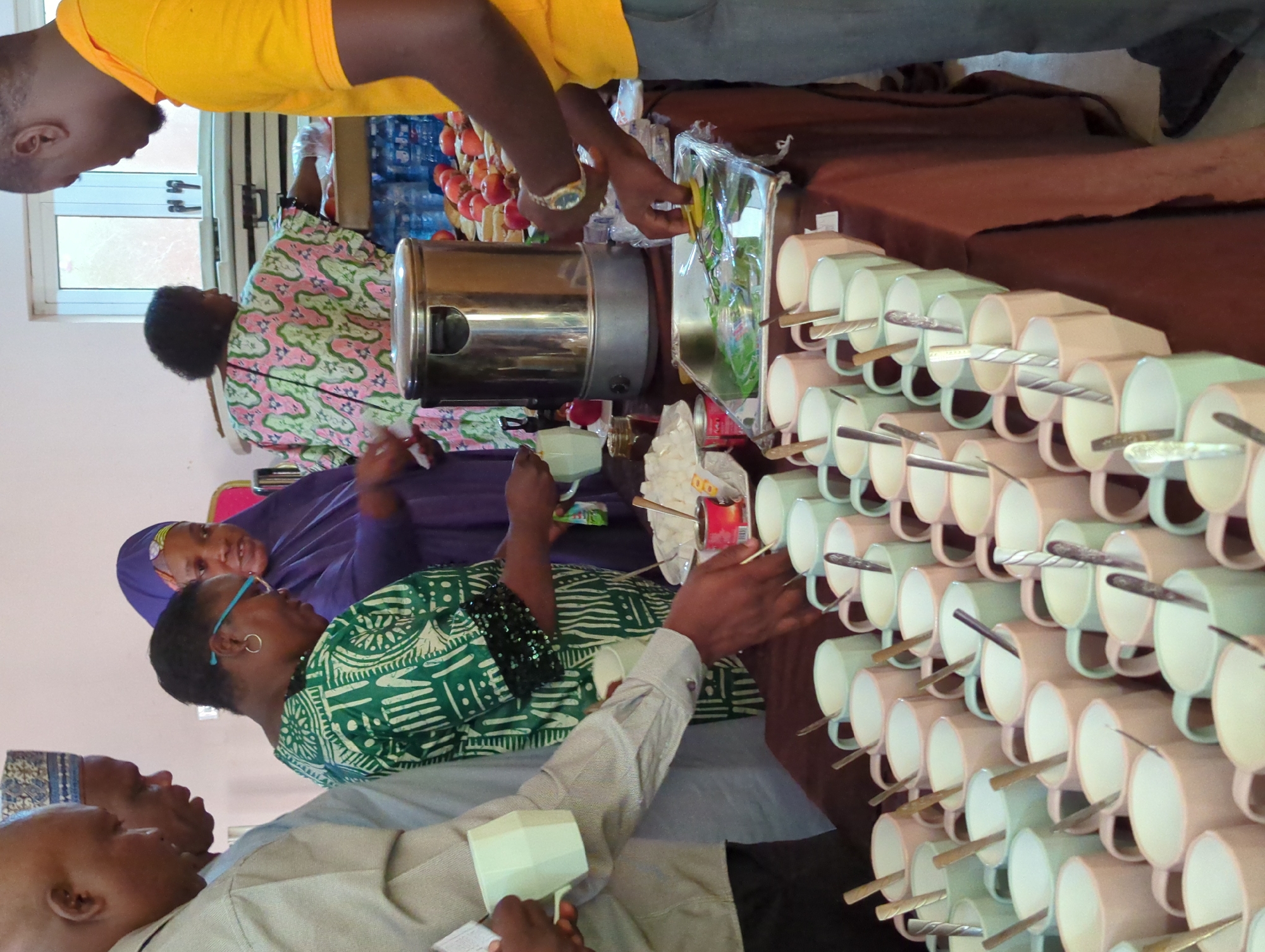 In Unguwar Rimi, Nigeria, an indoor scene depicts a group of people gathered around a table. A man in a yellow shirt stands at the table, attending to a silver beverage dispenser. Another person wearing gloves appears to be preparing refreshments. Several rows of pastel-colored cups are arranged on the table, each with a spoon inside. Among the attendees are women wearing colorful traditional clothing and headscarves. Individuals are either holding cups or interacting with one another, suggesting a social or communal gathering.