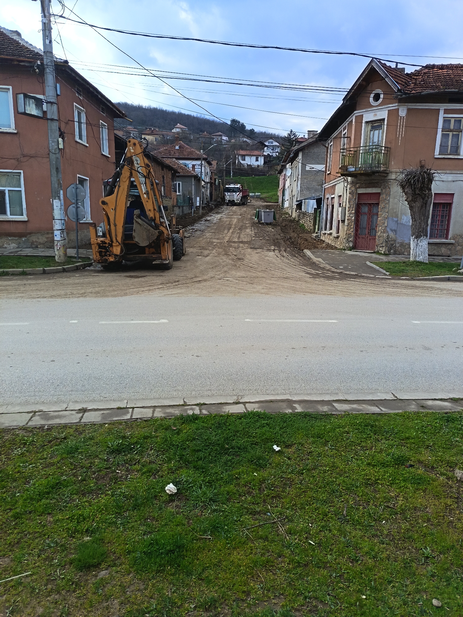 The image displays a street scene in Roman, Bulgaria, characterized by residential buildings and an unpaved side road under construction. In the foreground, a gray asphalt road with a dashed white centerline extends horizontally, bordered by a concrete curb and a grassy verge containing scattered debris. To the left, a two-story terracotta-colored building with white-framed windows stands next to a gray utility pole adorned with multiple wires and two circular road signs, one indicating "No Entry." Adjacent to this building, an orange Case backhoe loader is parked on a muddy, unpaved side street that ascends into the background. The backhoe's rear is visible, with its arm positioned upwards. To the right, a two-story brown-and-white building with a red-tiled roof features a small balcony with a green railing and a prominent red-framed door on the ground floor, which is clad in stone. A bare, gnarled tree with a white-painted base stands beside this building. The unpaved side street continues past this point, showing further evidence of excavation or mud, and a white dump truck with a red cab is visible further up the incline. The background reveals a forested hillside with additional houses scattered among the trees under an overcast sky crisscrossed by numerous power lines. No individuals are present in the scene.