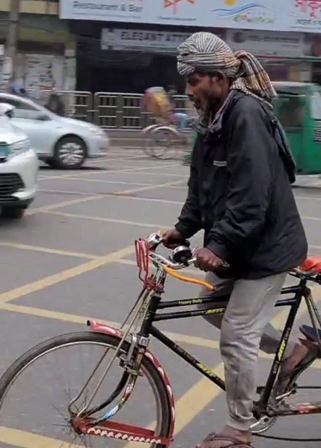 A rickshaw puller pedals his vehicle across a busy street. The man wears a turban and a dark jacket. A person rides in the back. Cars and pedestrians pass by on the street. Banners and buildings are visible in the background.
