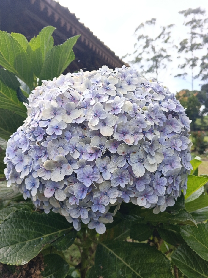 A large, spherical hydrangea bloom dominates the frame, showcasing a dense cluster of small, individual flowers. The color palette leans towards soft blues and purples, with hints of white and pale lavender creating a delicate, multi-toned effect. Green leaves surround the flower head, providing a vibrant contrast. In the background, a building with a wooden roof and distant trees blur into the soft, slightly overcast sky. The image composition draws attention to the intricacy and beauty of the hydrangea.