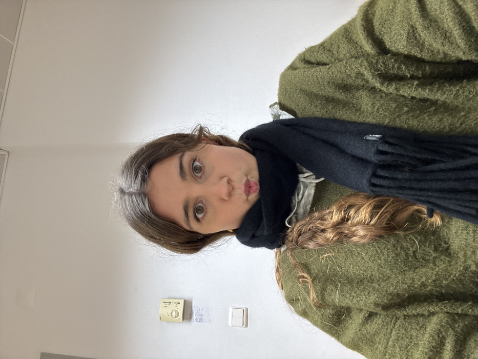 An indoor, waist-up image depicts a young Caucasian female posing in Porto Salvo, Portugal. The subject, with medium brown wavy hair parted centrally and wide brown eyes, looks directly at the camera with her lips pursed. She wears small gold hoop earrings, a thick olive-green knit sweater, and a light-colored ruffled collar shirt visible beneath a tightly wrapped black woolen scarf. The scarf has visible fringed ends and a small light-colored tag. The background is a plain off-white wall. On the left side of the frame, a beige wall-mounted thermostat with a circular dial and two vertically aligned white electrical switches/outlets are visible. Several small, affixed paper labels are present below the thermostat. A white ceiling tile is discernible at the top edge of the frame.