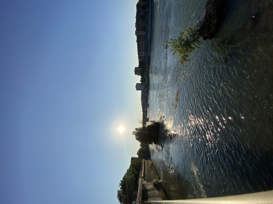 A river flows under a bright sun. Tall buildings line the distant bank. A dam or wall forms the near bank, with vegetation growing along it. The water surface is rippled and reflects sunlight. The sky is clear and blue. The image is angled vertically, making the scene appear to be tipped sideways.