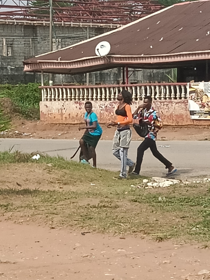 The scene is an outdoor urban environment in Owerri, Nigeria. Three individuals are observed walking from left to right across a dirt and sparse grass shoulder adjacent to a paved road. To the left, a male subject with dark skin and short hair wears a light blue t-shirt and a dark green wrapper or skirt, with light blue sneakers. He holds a dark, stick-like object, possibly a machete or club, pointed towards the ground and slightly behind him. In the center, a female subject with dark skin and dark hair styled upwards, wears an orange long-sleeved top underneath a visible black bra, and light grey baggy pants with faint vertical stripes. Her head is tilted back, and her gaze is directed upwards and slightly left. She wears open-toed footwear. To the right, a male subject with dark skin and short dark hair wears a multicolored patterned long-sleeved shirt featuring red, blue, yellow, and white designs, along with dark trousers and flip-flops. He carries a dark shoulder bag over his right shoulder, and his right arm is bent, with his hand positioned near his head. The background includes a building with a brown, sloping roof and a white satellite dish mounted on it. Below the roof, a white decorative balustrade extends over a weathered reddish-brown wall. Behind this, a structure with exposed red metal framework suggests construction or renovation. Green foliage is visible on the far left and behind the background buildings. A piece of white litter is on the grassy area in the foreground, near the road.