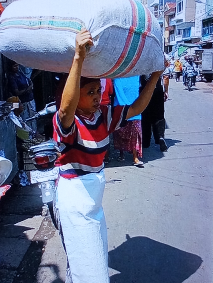 - "An individual is depicted centrally on an asphalt street in Samarinda, Indonesia, carrying a large, bulging white sack horizontally balanced on their head" by FM-V7J863, licensed under CC BY 4.0
