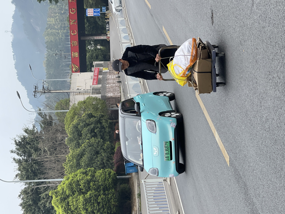 The image captures a roadside scene in Bishan, China, under an overcast sky