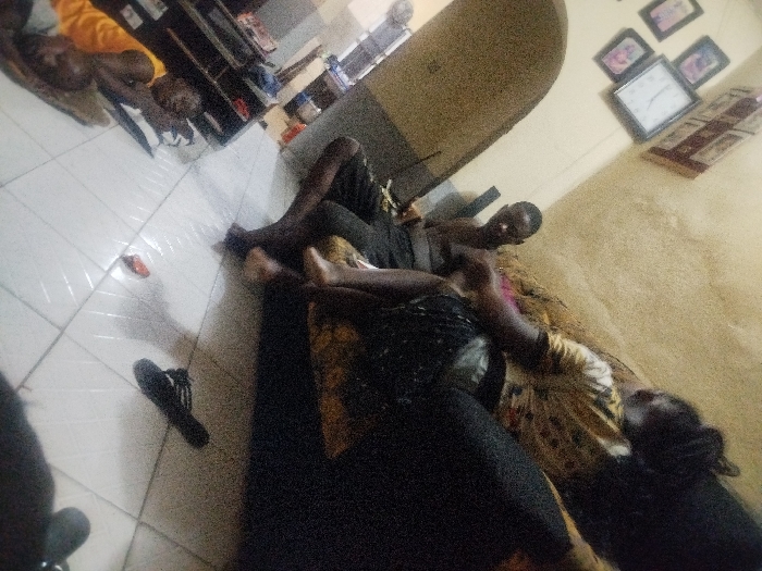 Several people are visible in the image, lying on a surface that appears to be a couch. One person is shirtless and looking at the camera. Another person is wearing a patterned yellow and brown top. A black sandal is on the tiled floor. Pictures and a clock hang on the wall. The lighting is dim.