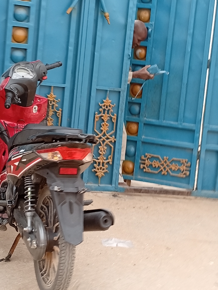 A red motorcycle stands in front of a light blue gate. The gate is decorated with golden accents and features round yellow and blue accents. A bald man peers through an opening in the gate, holding a rectangular object in his hands. The ground appears to be sandy or dirt. The image has a slightly tilted perspective.