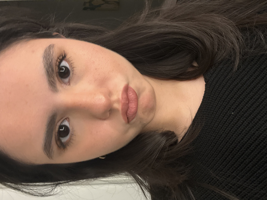 A woman with dark hair is facing the camera. Her skin appears fair, with slight freckling. Her eyebrows are full, and her eyes are brown with dark lashes. She wears a muted rose-colored lipstick. Her expression is neutral. She is wearing a black knit sweater. The image is rotated counterclockwise.