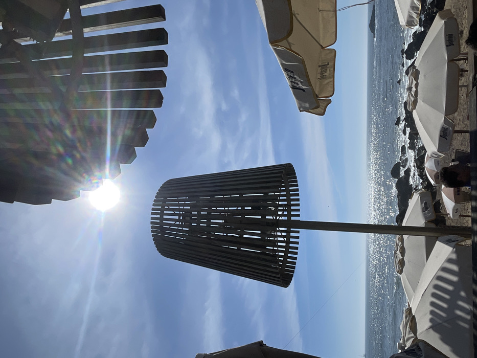 The scene depicts a bright, sunny outdoor area overlooking a rocky coastline and the Atlantic Ocean in Aldoar, Foz do Douro e Nevogilde, Portugal. In the foreground, a tall, conical outdoor light fixture, constructed from vertical wooden slats, is centrally positioned on a metal pole. A similar slatted wooden structure, likely part of a canopy or roof, is visible in the upper right. Below these structures, multiple open beach umbrellas with light-colored canopies, some bearing the "Segafredo" logo, are arranged on a sandy and rocky beach. One individual's head and shoulders are partially visible below an umbrella in the lower right, seated and facing away from the camera. The ocean, illuminated by strong sun glare causing shimmering reflections, forms the background, with waves breaking against numerous dark rocks along the shore. The sky is clear blue with minimal wispy clouds. The sun is high, positioned in the upper left, creating visible lens flare. A faint outline of a distant vessel is discernible on the horizon to the left.