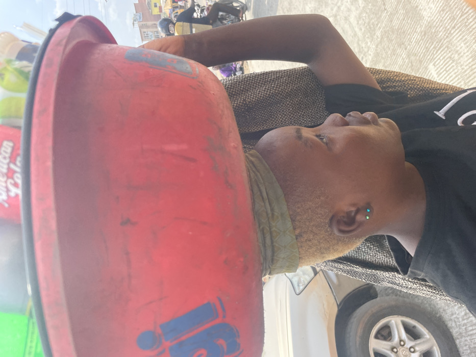 The image captures an outdoor scene in Agbara, Nigeria, depicting a street or market environment. A young individual with short, light-colored hair and dark skin is seen in profile, facing to the viewer's left. This individual wears a black t-shirt and two small, turquoise stud earrings in the visible left ear. A large, red plastic basin is balanced on their head, supported by a green-patterned fabric band. The basin contains various items, including packaged goods and a product partially identifiable as "American Cola." A blue "iGi" logo is visible on the side of the red basin. In the background to the left, the front wheel and fender of a light-colored vehicle are visible. To the right, a person wearing a helmet is operating a black motorcycle. The ground is paved, and distant buildings are present under a bright sky.