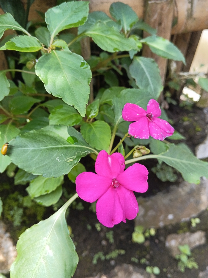 The scene is an outdoor close-up of a flowering plant in Unknown, Vietnam. Two bright magenta, five-petaled flowers are visible; one in the lower center is in sharp focus, and a second, partially obscured flower is above and to the right, slightly out of focus. The plant exhibits multiple ovate green leaves, some retaining spherical water droplets on their surfaces. A small, orange, ovate insect, approximately 5mm in length, is stationary on a leaf in the upper left quadrant. The background features blurred green foliage, segments of vertical bamboo poles forming a fence or support structure, and dark, moist soil with sparse green moss and small plant shoots.