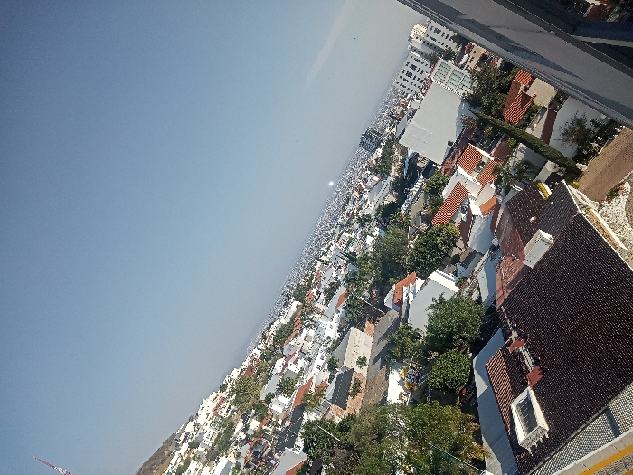 The image is an aerial shot of a densely populated urban area. The scene is dominated by buildings, mostly residential, with a mix of flat roofs and terracotta tiles. Green trees provide intermittent cover. The sky, a hazy blue, stretches towards the horizon. In the distance, taller structures suggest a downtown area. The angle gives a strong perspective of the urban sprawl.