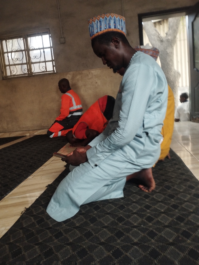 man in a blue and white patterned cap and a light blue robe kneeling on a patterned black rug inside a building in Ashaka, Nigeria, at 10