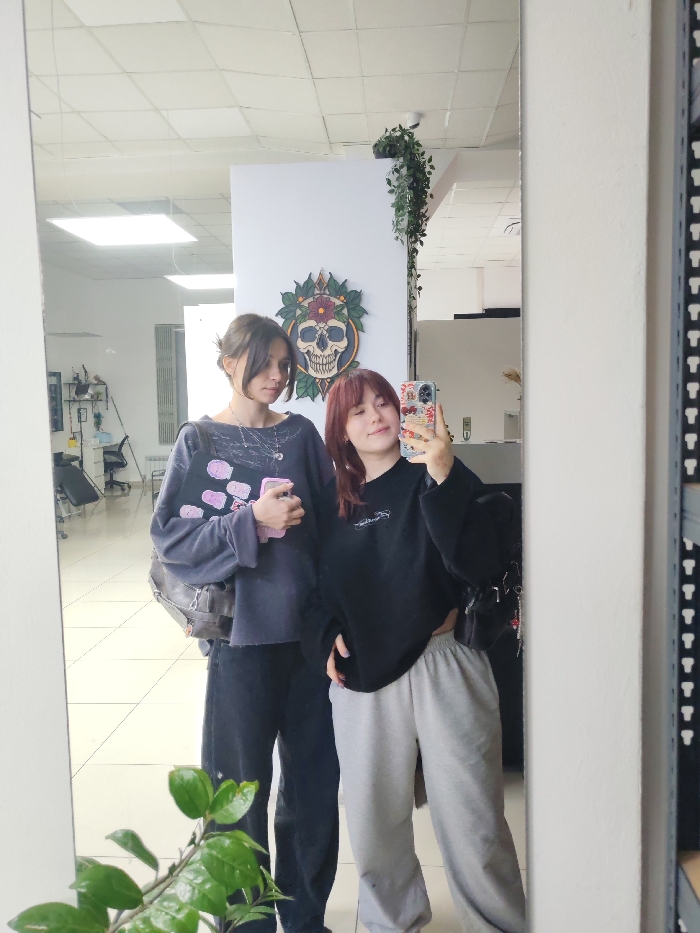 Two young women pose for a mirror selfie. The woman on the left has light brown hair and wears a dark sweater with light-colored graphics and dark pants. She carries a bag over her shoulder. The woman on the right has reddish-brown hair and wears a black sweater and gray sweatpants. She holds a phone with a floral patterned case, taking the picture. A decorated skull is behind them, and green plants are visible in the mirror's reflection and in front.