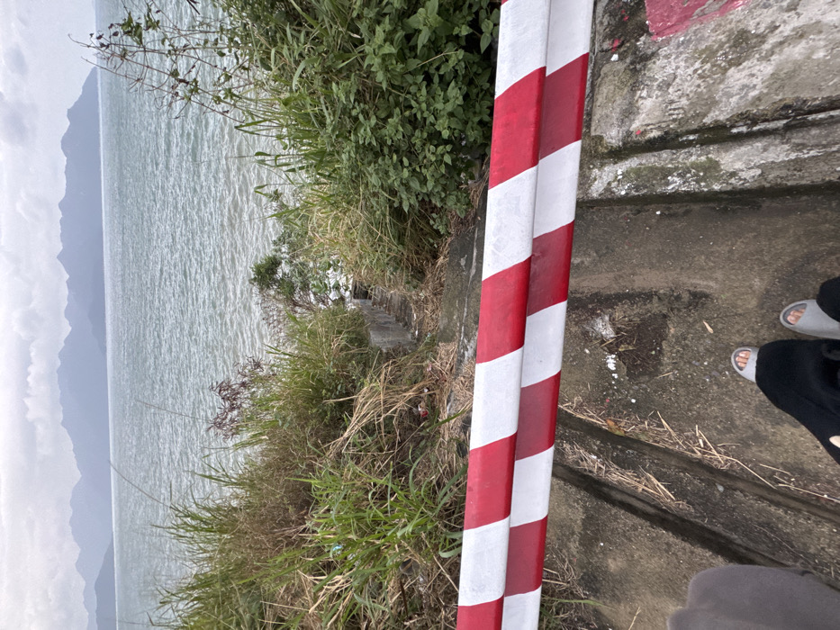 A first-person perspective photograph captures an outdoor scene overlooking a body of water in Vĩnh Lương, Vietnam. The immediate foreground shows two feet wearing light grey sandals, positioned on a textured, weathered concrete surface with visible drainage channels. A horizontal barrier, composed of two parallel rails painted with alternating red and white diagonal stripes, extends across the lower-mid portion of the frame, indicating a restricted area or edge. Beyond the barrier, a concrete stairway, partially overgrown with vegetation, descends an embankment towards the water. The embankment on either side of the stairs is densely covered with a variety of green and brown grasses, weeds, and shrubs, with some scattered debris and litter visible. The midground and background feature a wide expanse of choppy, grey-green water, indicative of a sea or large bay. Across the water, a series of distant, layered mountains or large hills with hazy, dark profiles are visible under an overcast, light grey sky. No other individuals or specific actions are discernible. The environment is consistent with a coastal or lakeside setting on a cloudy day.
