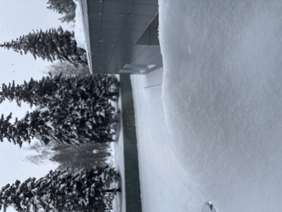 A snowy landscape includes evergreen trees covered in snow, visible through a window. A thick layer of snow is accumulated on the window or ledge, with a structure visible, potentially a roof or part of a building, also covered in snow. The scene is overcast, and the focus is on the contrasting textures of the snow-covered trees and the smooth snow on the foreground surface.