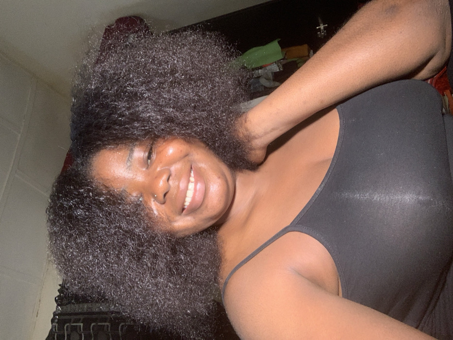 A woman smiles, head tilted, revealing a nose piercing. She is wearing a black spaghetti-strap top. Her dark hair is voluminous and curly. One arm is raised behind her neck. The background is dark with a hint of clutter, suggesting an indoor setting. The lighting emphasizes her features and hair texture.
