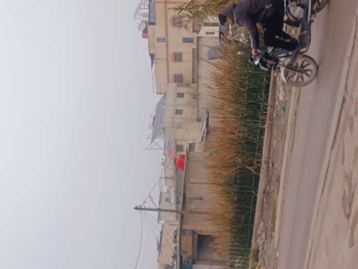 The image depicts an urban street scene in Kafr Sousa Municipality, Syria. In the foreground, a multi-lane paved road, appearing wet or soiled, occupies the lower third. To the right of the road, a dirt shoulder with visible debris, including a green plastic item, leads to a dark metal fence. Behind the fence, a dense, tall patch of dried vegetation, exhibiting brown, orange, and dull green tones, runs horizontally across the mid-ground. Behind the vegetation, a cluster of residential and commercial buildings of varying heights and construction styles is visible. Many rooftops are flat and feature red cylindrical water tanks, multiple solar panels, and satellite dishes. A prominent utility pole with overhead wires is positioned to the left among these structures. The background consists of additional buildings, partially obscured, beneath a uniform, light grey, overcast sky that covers the upper half of the image. A single individual, dressed in a dark hooded jacket and dark pants, is operating a light-colored scooter (or moped) on the paved road, traveling from right to left. The person is seated upright, holding the handlebars.